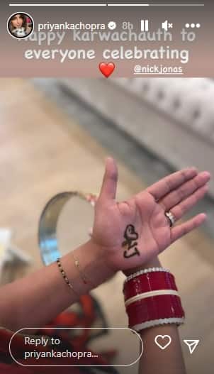Taking it to the story of her Instagram account, Priyanka dropped a picture of her mehendi-applied hand, which flaunted the initials of the American singer. While sharing the picture, the actress wrote in the supers, “Happy Karwa Chauth to everyone celebrating.” Priyanka even tagged her husband Nick in the photograph and dropped a red heart emoticon next to his name. In the picture, Priyanka can be seen showing the palm on her left to the camera that has a heart and “NJ” written with mehendi. While Priyanka can be seen holding the sieve that is used to perform the ritual in Karwa Chauth, her left hand can be seen adorned with traditional red bangles. Not only this but also the slightest glance of her cloth reveals that Priyanka sported an ensemble red in colour.